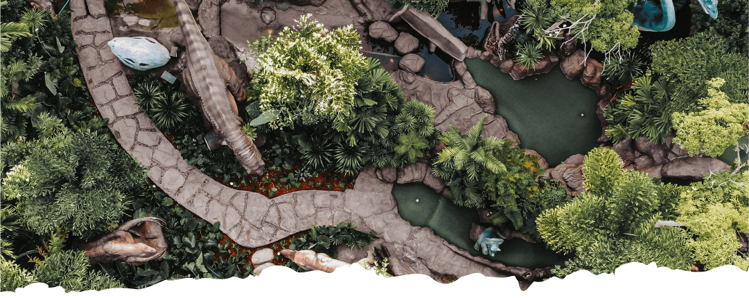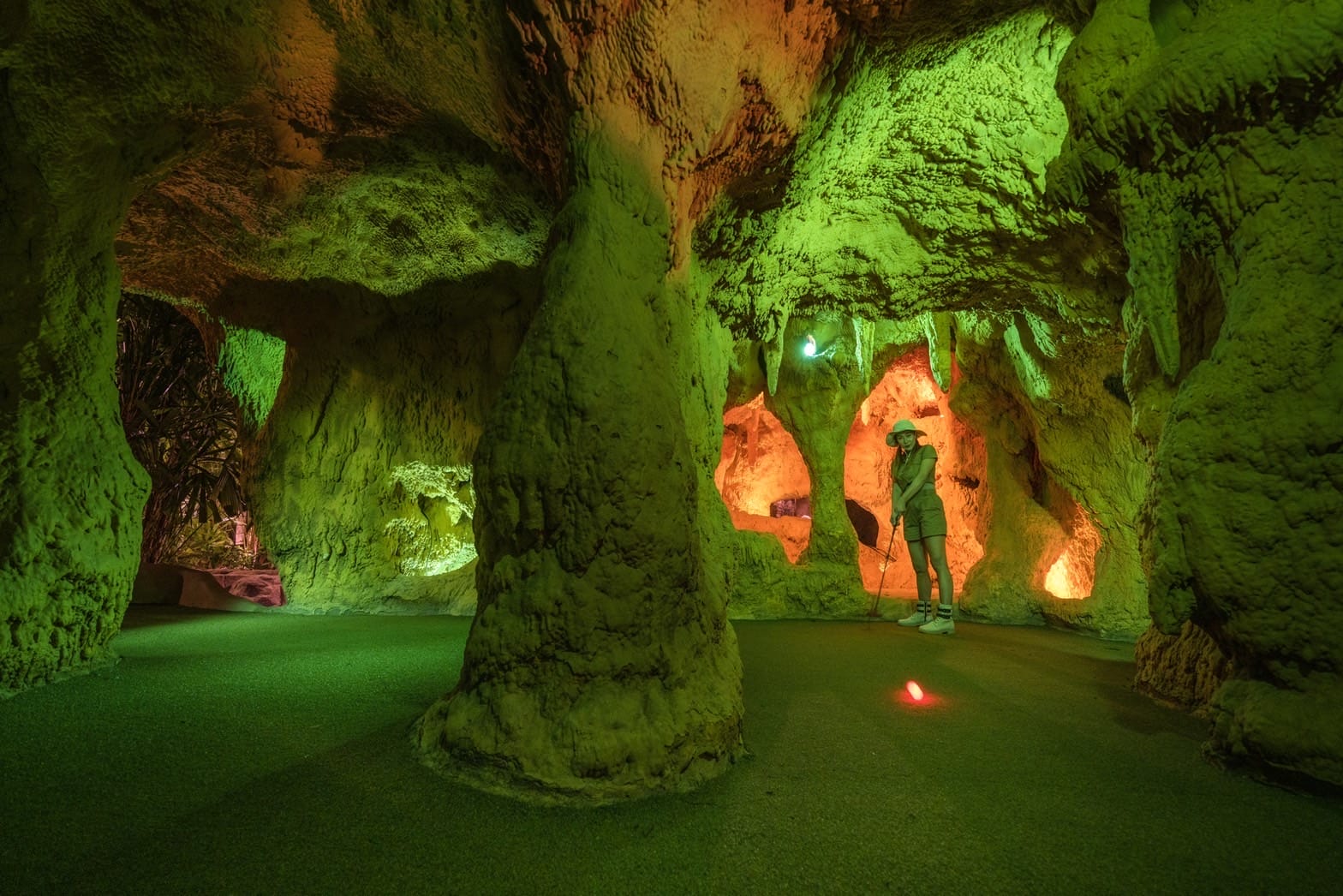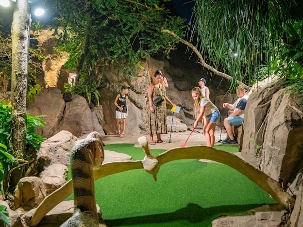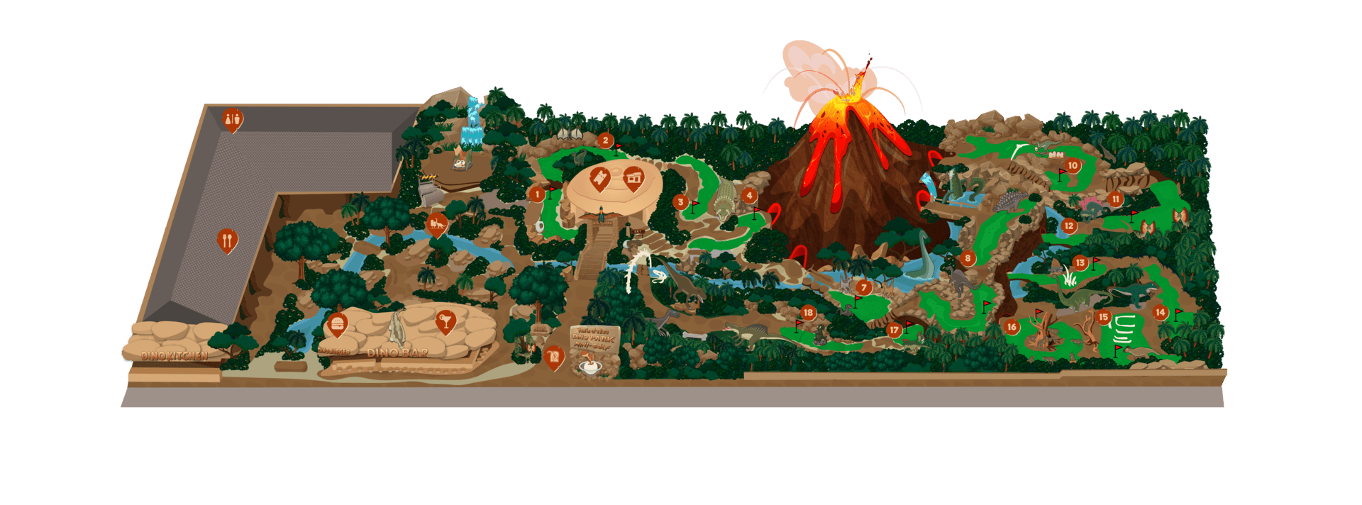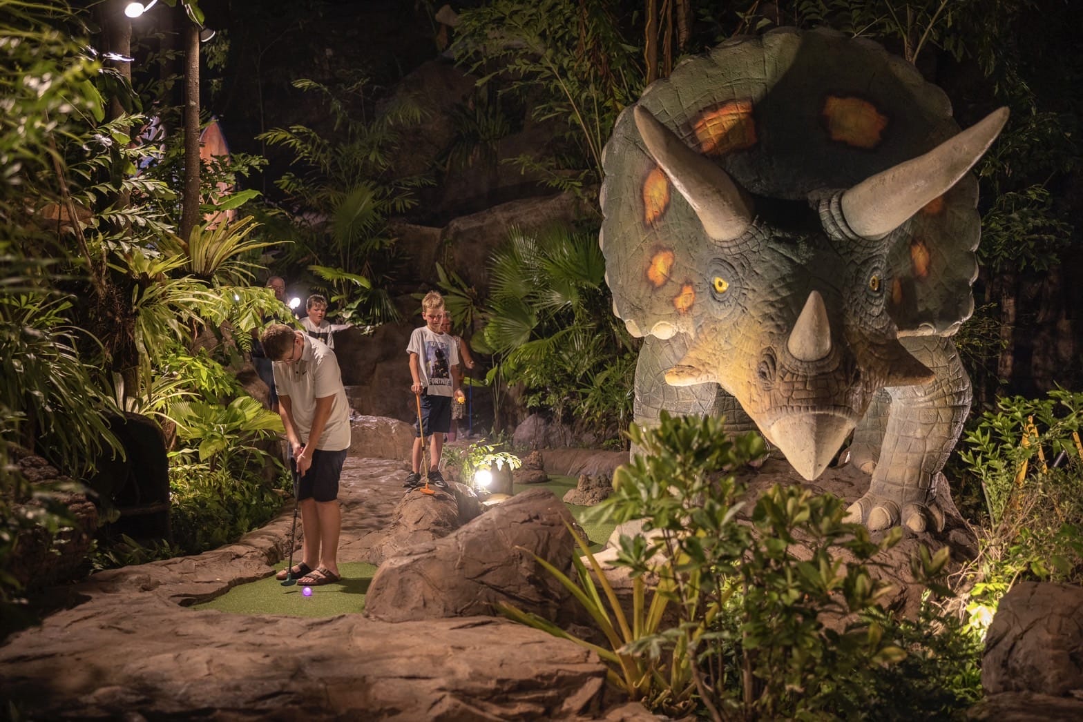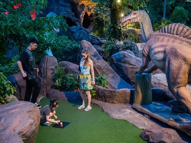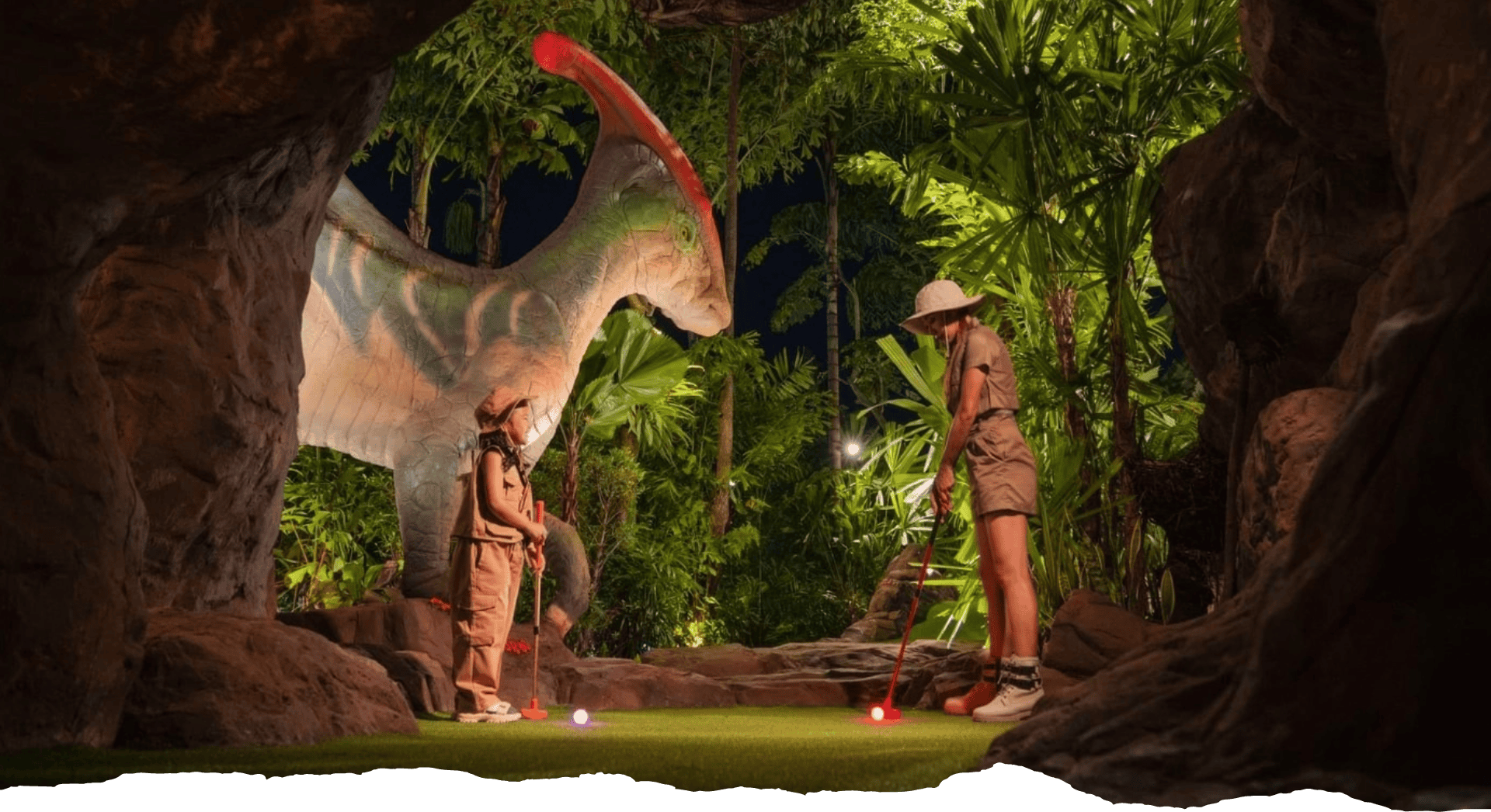 侏罗纪主题迷你高尔夫球场:18 洞球场贯穿逼真的侏罗纪世界,沿途分布着多种巨型恐龙模型。目前,公园新增了高水准电子恐龙,其动作栩栩如生,搭配模拟火山喷发的先进声光特效,为游客带来沉浸式的冒险体验。